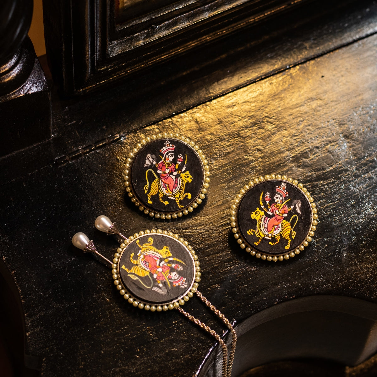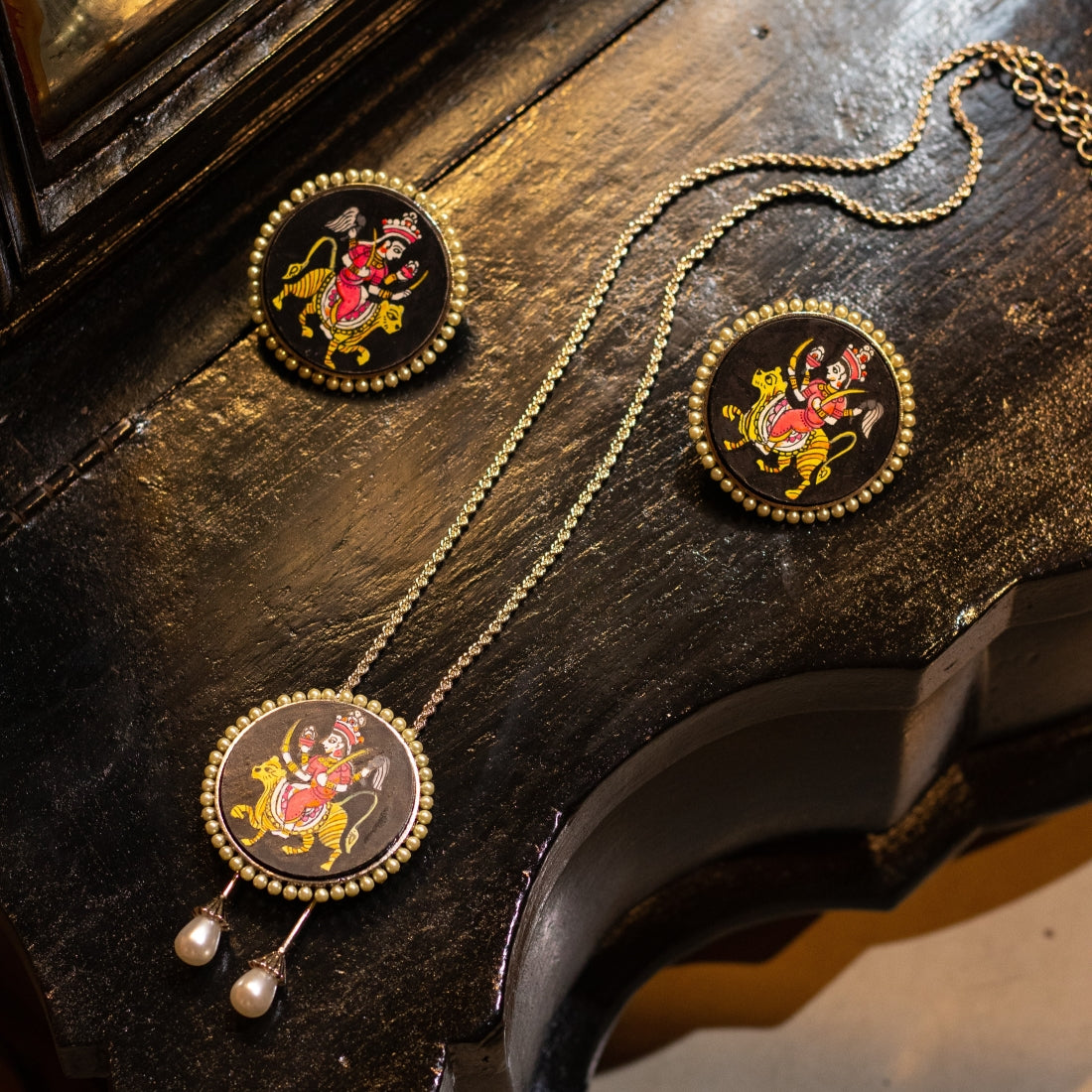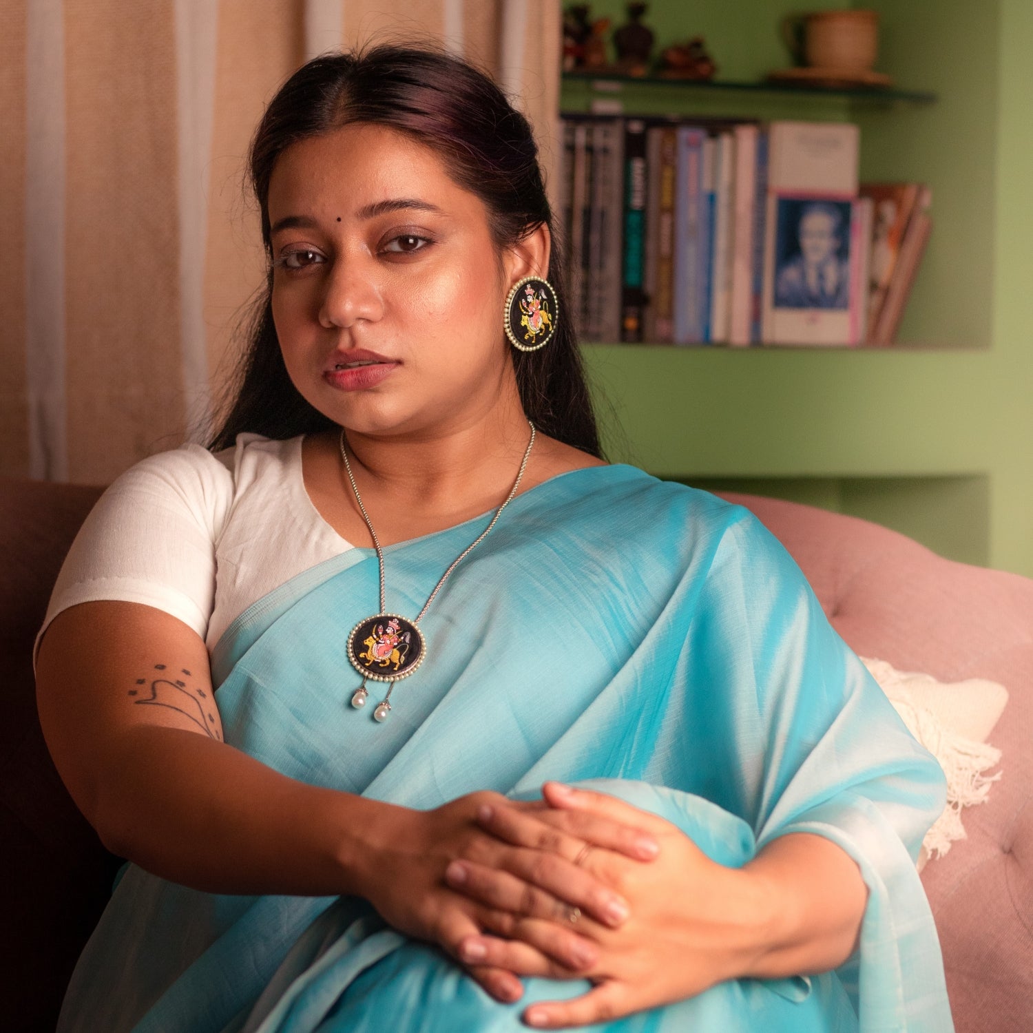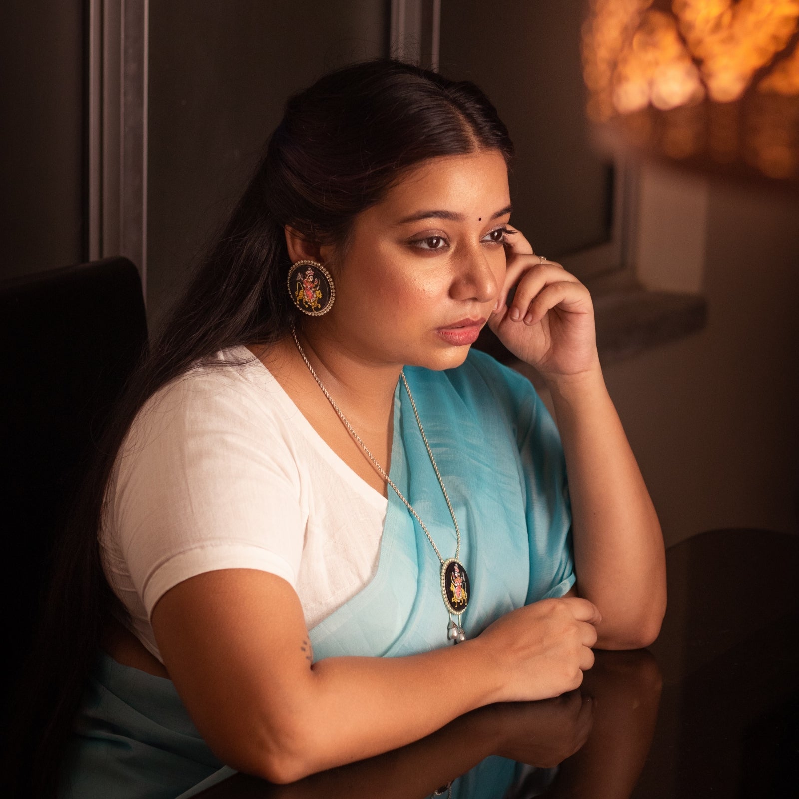 We experimented with an almost extinct artform called 'Mata Ni pachedi' to create this piece. A statement piece to go with subtle elegant silhouettes this set is suitable for someone who has an eye for detail.