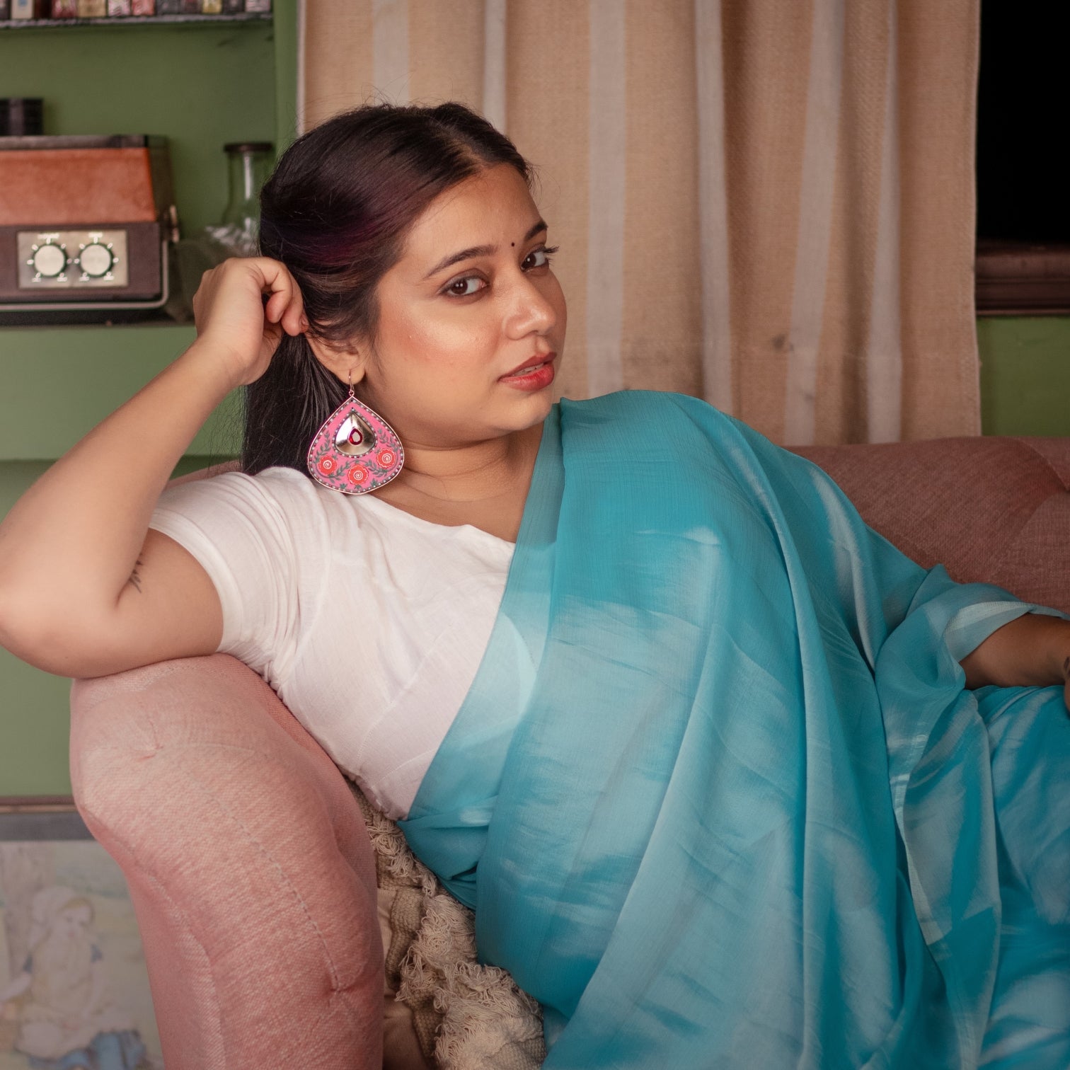 If you like to wear monochromatic shades then this one is a perfect addition to your collection. Also goes with materials like cotton handblock prints or chikankaris.