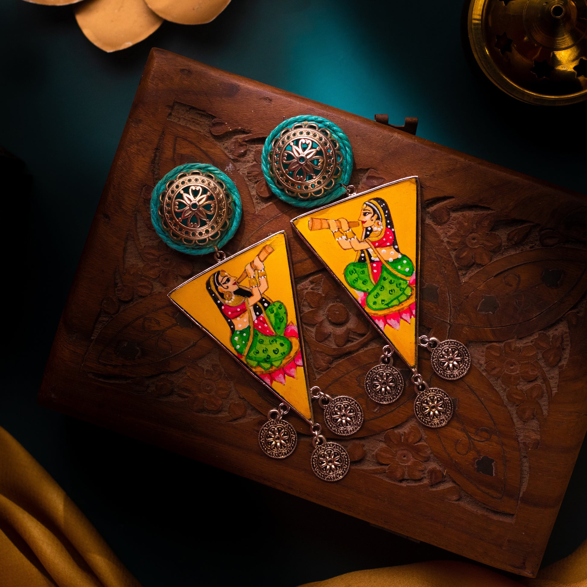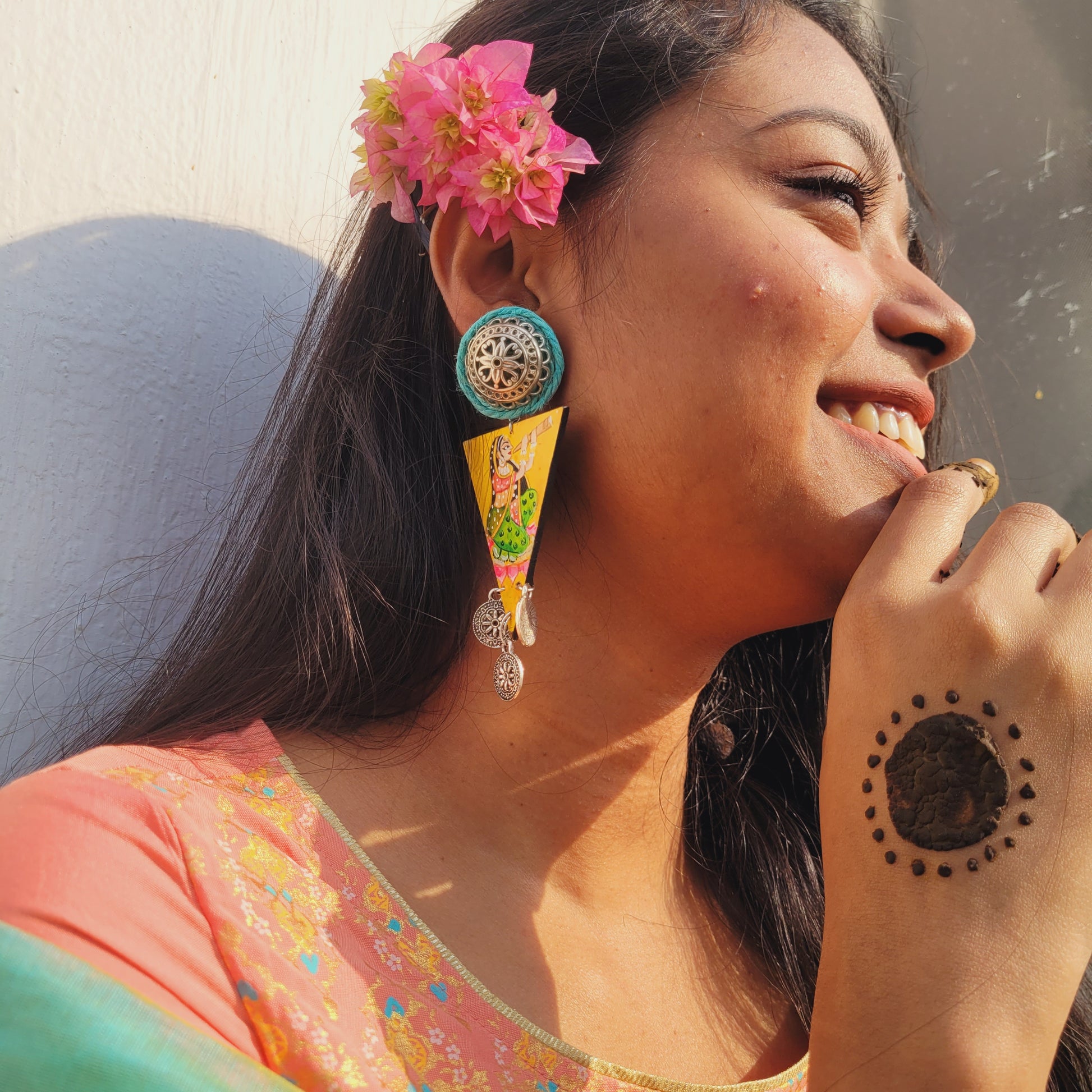 Mehendika is also an inspirational piece from Mughal art. Many Mughal painting has been influenced by real life events. This intricate painting depicting a female musician has a unique flavor and adds soul to it. Thus we thought why not use it in our collection. Bring out that soulful you with our Mehendika.