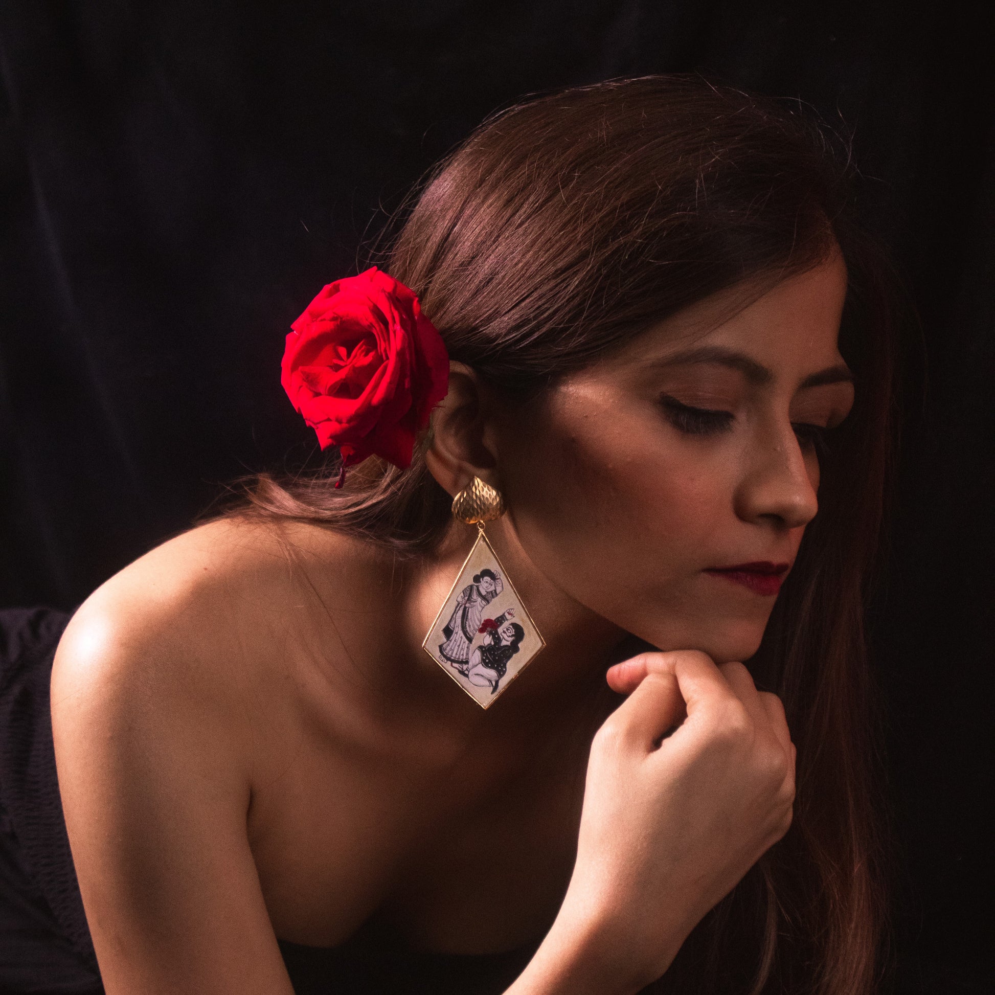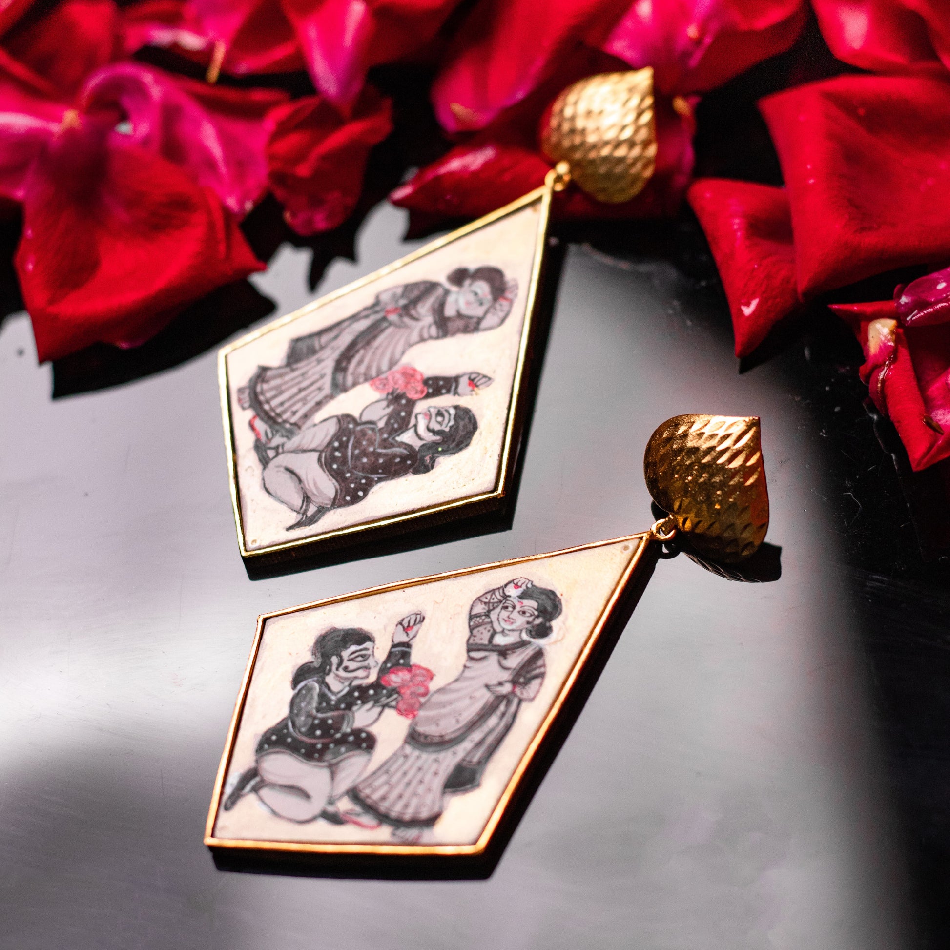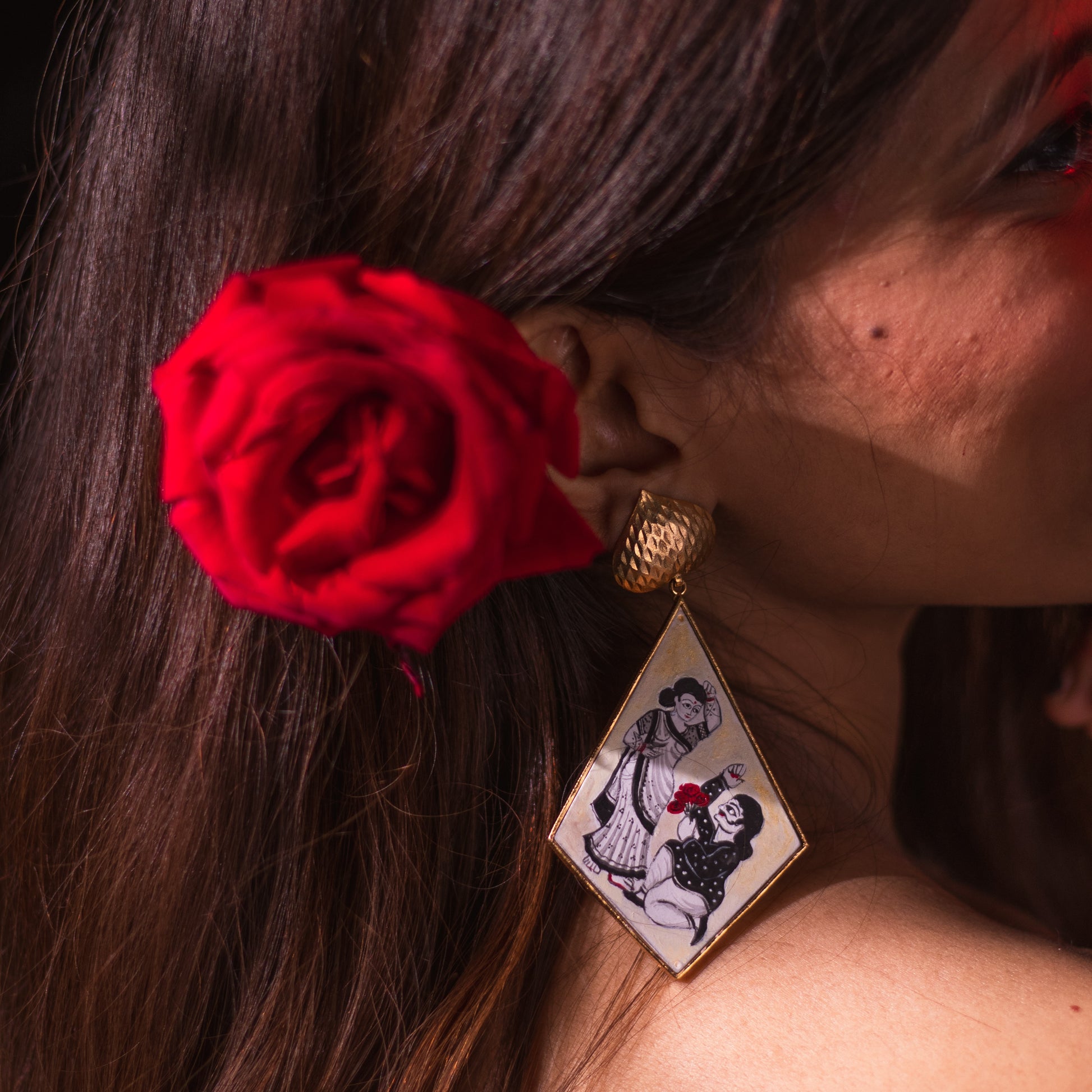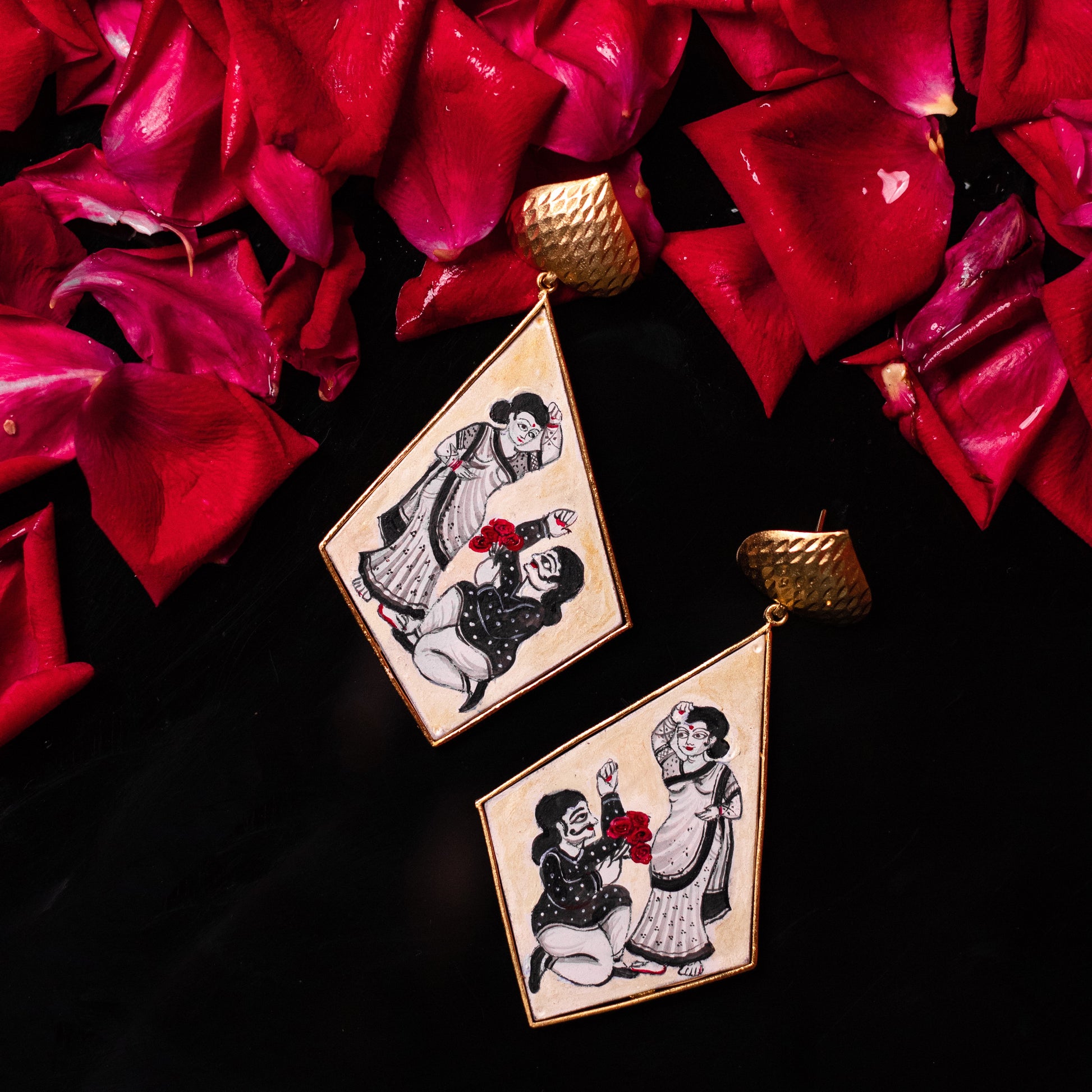 This hand painted piece has been inspired from Kalighat Pattachitra. The elongated kite shaped structure gives it a very unique look with "babu oh Bibi " painted on it.