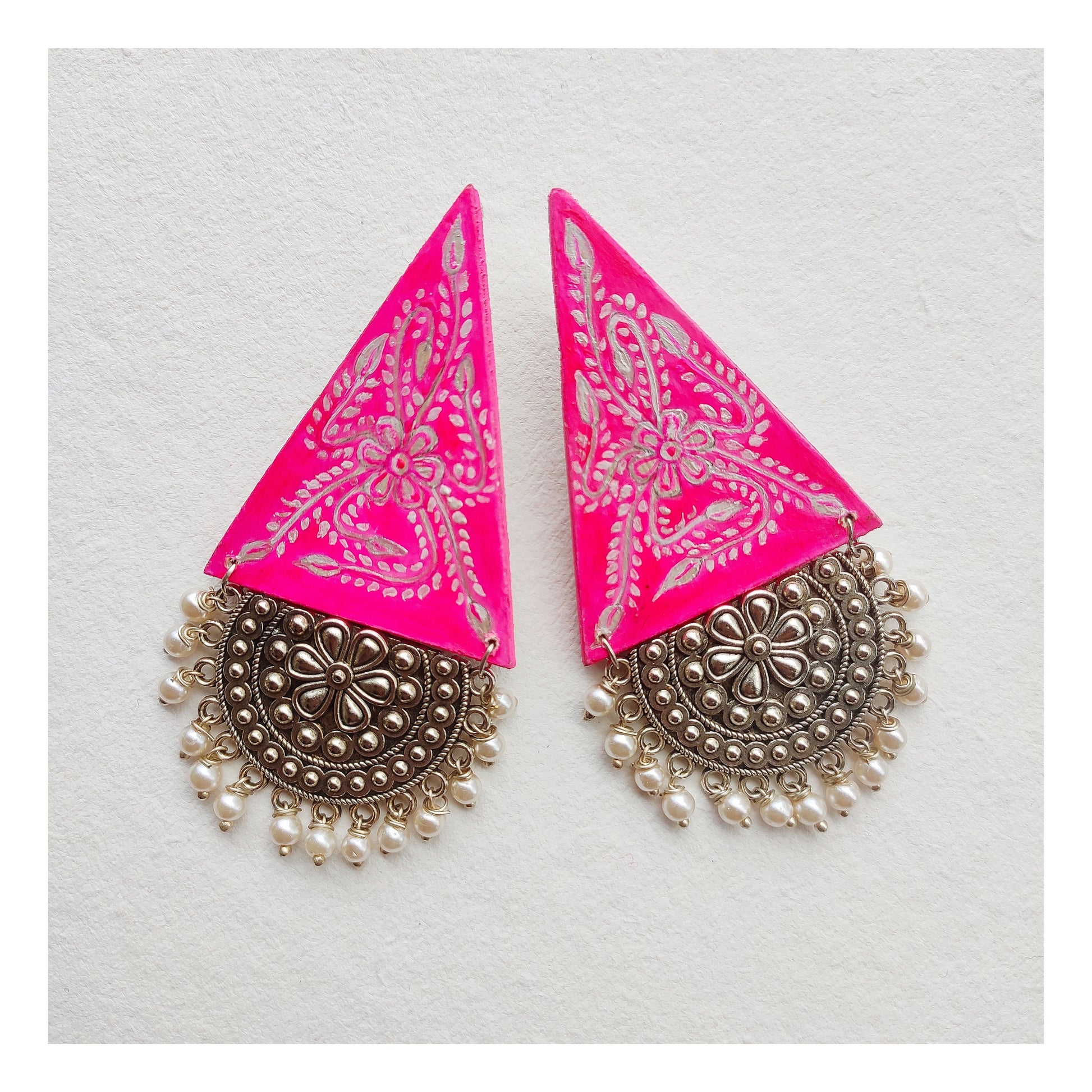 A unique triangle shaped earrings with centrifugal leafy vines handpainted on vibrant shades. ( pink, blue, red , black) The half disc metal add the right amount of charm to the piece.